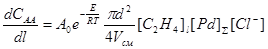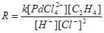 Кинетическое уравнение для реакции (2) в присутствии п-бензохинона (Q) было получено в закрытой системе без газовой фазы (И.И.Моисеев и др.) и по поглощению этилена в двухфазном реакторе полного смешения волюмометрическим методом (П.Генри). В области концентраций PdCl2 до 0.02 М при постоянной ионной силе (I = 1 – 3) в системе NaCl – LiClO4 – HCl – HClO4 = Const Pd(II) находится преимущественно в форме PdCl4 2– , и закомплексованность Pd(II) этиленом не существенна. Скорость реакции (2) или реакции (5)