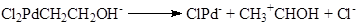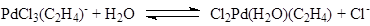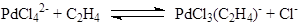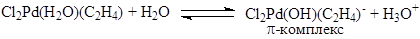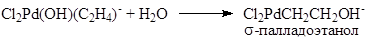Из уравнения (6) следует, что процесс протекает с лимитирующей стадией и что в стадиях до лимитирующей выделяются ион Н+ и два иона Cl– при взаимодействии PdCl4 2– и C2 H4 . Для выяснения вопроса о том, из какой частицы выделяется Н+, провели опыты с меченым этиленом (C2 D4 ) в H2 O. Оказалось, что ацетальдегид содержит 4 атома D (CD3 CDO) и, таким образом, Н+ может выделяться только из молекулы H2 O. Схема механизма, соответствующая уравнению (6) и подтвержденная независимым исследованием равновесий в этой системе, включает стадии