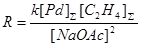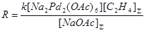 в предположении, что в условиях квадратичного торможения ацетатом натрия весь Pd(II) находится в форме комплекса Na2 Pd(OAc)4 . В работе П.Генри приведена другая форма уравнения (16) в предположении, что активной формой Pd(II) является димер Na2 Pd2 (OAc)6 , концентрация которого проходит через максимум по [NaOAc]