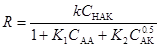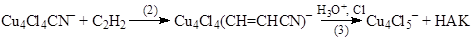 Процесс проводят в системе CuCl – NН4Cl – НCl – Н2 О при 85°С. Выход НАК составляет ~ 80% по ацетилену и 90% по синильной кислоте. Скорость реакции описывается уравнением (21)