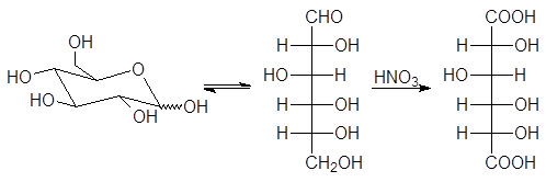 Разбавленная азотная кислота, являющаяся более сильным окислителем, чем бромная вода, окисляет не только альдегидную группу, но и терминальную спиртовую группу в карбоксильную. Образующиеся при этом полигидроксидикарбоновые кислоты называют альдаровыми кислотами.