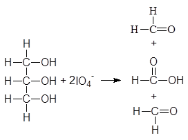 Следует заметить, что при этом окислении вместо разорванной С¾С-связи у каждого из атомов углерода появляется связь С¾О. Если в молекуле рядом с гидроксильной группой имеется две другие гидроксильные группы, то образуется муравьиная кислота. По составу и соотношению образующихся продуктов окисления можно судить о строении исследуемого вещества. Напиример, периодатное окисление глицерина приводит к образованию двух мольэквивалентов формальдегида и одного муравьиной кислоты.