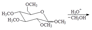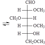 Процесс называется исчерпывающим алкилированием. Метоксигруппы при С-2, С-3, С-4 и С-6 пентаметилглюкопиранозида являются обычными эфирными группами. Эти группы устойчивы в слабокислых водных растворах. В то же время метоксигруппа при С-1 отличается от других тем, что она является ацетальной (гликозидной). Поэтому при гидролизе в слабокислом растворе отщеплению подвергается лишь гликозидная группа: