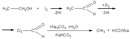 при обработке свежеприготовленным раствором йода и едкой щелочи переходят в йодоформ, причем промежуточно получаются трийодзамещенные продукты. Например: