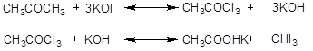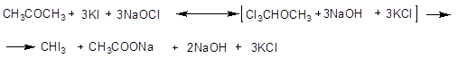 Это действие йода в щелочном растворе служит качественной реакцией на ацетон, этиловый спирт, ацетальдегид и т.д. и может служить также для количественного определения ацетона, спирта, молочной кислоты, окисляемых сначала до ацетальдегида (йодоформная реакция Либена).