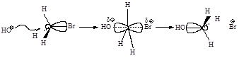 Стадии процесса. Нуклеофил атакует атом углерода с тыла, со стороны наиболее удаленной от брома (рис.2.1, а). Если сталкивающиеся частицы имеют достаточную энергию, то начинает образовываться связь углерод-кислород, а связь углерод-бром растягивается, атом углерода переходит в sp2 -состояние. В этом состоянии атом углерода связан сразу с пятью атомами. Три атома водорода и углерод лежат в одной плоскости, а группы НО- и Br- располагаются на прямой, перпендикулярной этой плоскости (рис. 2.1, б ). Отрицательный заряд на атоме кислорода уменьшился, так как кислород уже подал свою пару электронов на атом углерода, а отрицательный заряд на атоме брома увеличился, поскольку бром в определенной мере оттянул на себя пару электронов от углерода. Реакция заканчивается отщеплением иона брома и образованием ковалентной связи углерод-кислород, атом углерода опять становится тетраэдрическим (рис. 2.1, в).