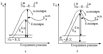 Растворитель. Переходное состояние SN 1-реакции более полярно, чем исходное состояние. Увеличение полярности растворителя способствует большей сольватации переходного состояния по сравнению с сольватацией исходного соединения. Это приводит к росту скорости реакции.