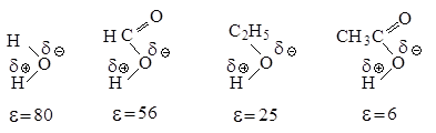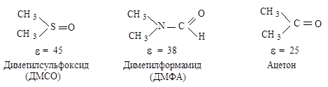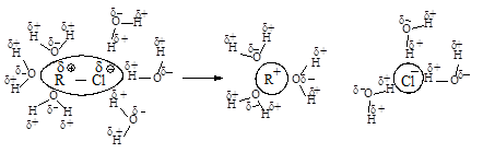 В растворителе, имеющем высокую диэлектрическую проницаемость, легче протекает ионизация галогеналкана, но, в отличие от апротонных растворителей, в протонном сольватируется не только карбокатион, но и ион галогена, образуя с ним водородные связи.