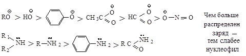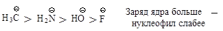 Нуклеофильный реагент, предоставляющий пару электронов электронодефицитному атому углерода, способен подавать эту пару атому водорода и отщеплять его, превращаясь в кислоту, т.е. каждый нуклеофильный реагент является основанием. Нуклеофильная реакционная способность и основность изменяются параллельно у реагентов, в которых пара электронов находится на одном и том же атоме или неподеленная пара электронов находится у атомов элементов, принадлежащих одному периоду.