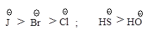 Такой порядок изменения нуклеофильности в протонном растворителе объясняется тем, что анионы разного размера в протонном растворителе в различной степени сольватированы за счет образования водородных связей: анион малого размера с концентрированным зарядом сольватируется сильнее и стабилизирован в большей степени, чем анион большего размера, в котором отрицательный заряд распределен в большей степени.
