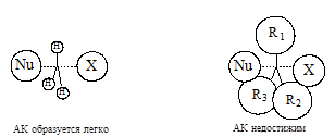 Реакционная способность. При рассмотрении реакционной способности галогеналканов в реакциях нуклеофильного замещения следует изучать влияние двух факторов: пространственного (стерического) и электронного. В случае бимолекулярного нуклеофильного замещения наиболее важную роль играет стерический фактор. По мере увеличения числа и объема заместителей у атома углерода - реакционного центра возможность достижения активированного комплекса уменьшается. Это могут быть как алифатические, так и ароматические заместители или те и другие.