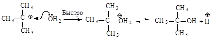 Вторая стадия - образовавшийся карбокатион практически мгновенно взаимодействует с нуклеофилом – молекулой воды.