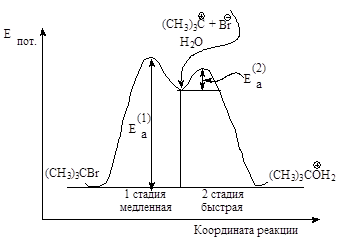 Рис.2.4. График изменения потенциальной энергии в ходе мономолекулярного нуклеофильного замещения. SN 1-двухстадийный последовательный процесс.