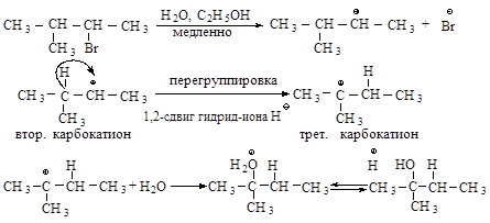 Перегруппировка. В медленной стадии реакции образуется карбокатион - частица, способная к перегруппировке. Галогеналканы могут реагировать по механизму SN 1 через стадию перегруппировки первоначально образующегося карбокатиона: если в результате 1,2-сдвига отрицательно заряженной частицы образуется более устойчивый карбокатион, то происходит перегруппировка.