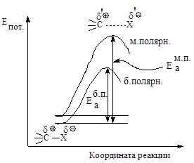 Рис.2.5. Влияние полярности растворителя на скорость реакции мономолекулярного нуклеофильного замещения