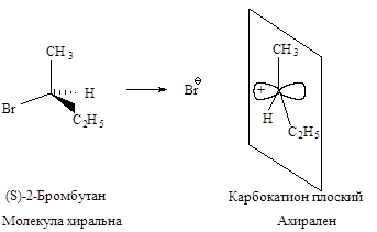 Стереохимия. В карбокатионе, образующемся в медленной стадии, связи sp 2 -гибридизованного атома углерода расположены в одной плоскости. Если SN 1-замещение протекает у хирального атома углерода, то образующийся плоский карбокатион становится ахиральным.