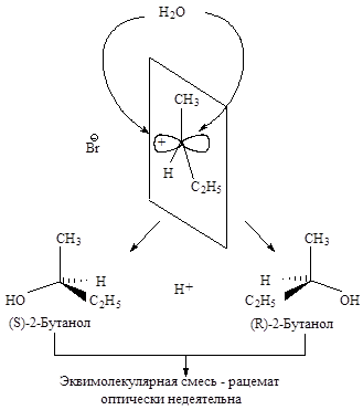 Последующая атака нуклеофильного реагента происходит с одинаковой вероятностью и с той и с другой стороны плоского карбокатиона. Следовательно, половина образующихся молекул будет иметь ту же конфигурацию, что и исходное соединение, а половина - будет его зеркальным изображением, т.е. образуется эквимолекулярная смесь энантиомеров - рацемат. Такая реакция приводит к оптически неактивному продукту.
