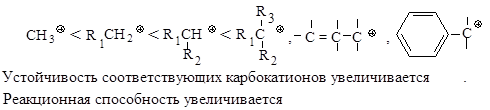 Реакционная способность. Главным фактором, определяющим реакционную способность в SN 1-реакции, является электронный фактор - устойчивость образующегося в медленной стадии реакции карбокатиона. Чем устойчивее карбокатион, тем легче он образуется, тем быстрее протекает замещение.