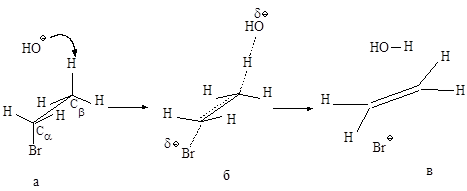 Рис.2.6. Механизм реакции бимолекулярного элиминирования; а – антикомпланарное расположение связей Сa —Br и Сb —H, б – переходное состояние, в – конечные продукты.