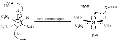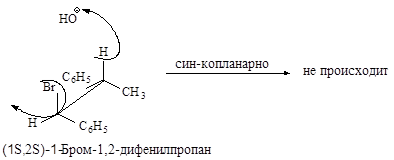 Связи, разрывающиеся в активированном комплексе, должны быть в транс- положении друг к другу. Такая геометрия позволяет электронной паре, освобождающейся при связывании протона с основанием, атаковать с тыла атом углерода Сa и вытеснять галоген. Копланарность двух связей субстрата: Сa -Br и Сb -Н, которые разрываются в активированном комплексе, обеспечивает максимальное перекрывание р-орбиталей, то есть способствует процессу образования p-связи. Такая комбинация условий называется стереоэлектронным требованием.