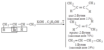 Основным продуктом реакции элиминирования 2-хлорбутана является транс-2-бутен (соотношение цис- и транс -изомеров 1:6). Активированный комплекс, возникающий при образовании транс- изомера, менее пространственно затруднен и более устойчив, и, следовательно, скорее образуется, чем активированный комплекс, ведущий к цис -изомеру.