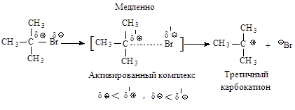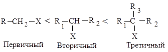Реакционная способность галогеналканов увеличивается при переходе от первичных к третичным. Это обусловлено увеличением устойчивости карбокатионов, образующихся в медленной стадии.