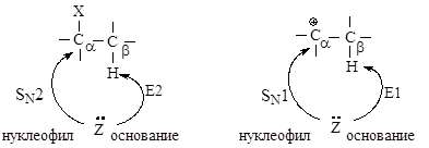 В реакциях замещения донор электронной пары отдает свою пару электронов атому углерода Сa , связанному с галогеном - в этом случае он является нуклеофилом. Тот же донор электронов может отдавать свою электронную пару атому водорода, связанному с Сb - в этом случае он является основанием в реакциях элиминирования.