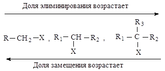 Реакции элиминирования и нуклеофильного замещения в этом случае являются конкурирующими. При переходе от первичных ко вторичным и далее третичным галогеналканам элиминирование происходит все в большей степени.