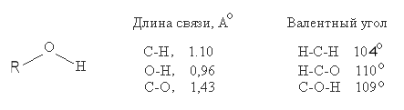 Пространственное и электронное строение, длины связей и валентные углы в спирте приведены ниже.