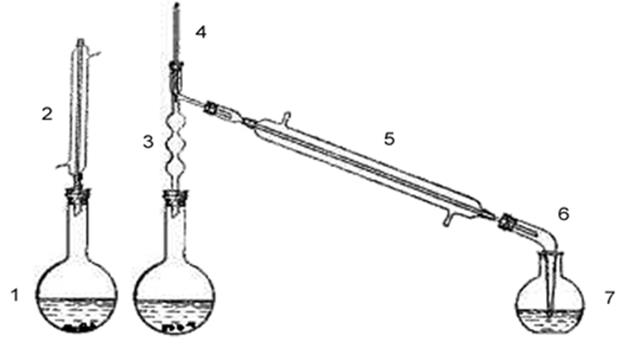 В круглодонную колбу на 50 мл. помещаем 4-бромбензойную кислоту 4г., этиловый спирт 25 мл., серную кислоту 1мл. Смесь нагревам на воздушной бане с обратным холодильником. Затем заменяем обратный холодильник на нисходящий и полно отгоняем избыток спирта. Остаток выливаем в 20 мл. холодной воды и нейтрализуем углекислым натрием. Затем отделяем при помощи делительной воронки эфирный слой и сушим его хлористым кальцием.