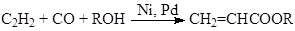 В реакциях СО с олефинами и алкинами участвуют также молекулы других реагентов – Н2О, ROH, RNH2 и др. Эти процессы были открыты В. Реппе в начале 40-х гг XX века и протекают в растворах комплексов Ni(0, II) и Pd(0, II). Например,