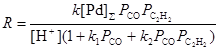 Процесс требует высокой температуры ~ 150оС и, следовательно, высокого давления (> 30 атм) для предотвращения распада термически неустойчивых комплексов Со. Критическое давление Р > 10 атм при 120оС. Строгая кинетическая модель этого сложного процесса пока не получена. Отмечено сильное торможение оксидом углерода и важная роль координационно-ненасыщенных комплексов HCo(CO)3 и C2H5COCo(CO)3. Экспериментально полученное кинетическое уравнение (2)