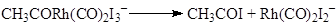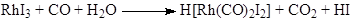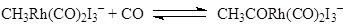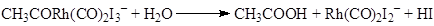 В условиях, когда концентрация воды в СН3СООН > 8% (масс) переход Rh(I) в Rh(III) в стадии (18) является медленной стадией. Распад ацильного комплекса до CH3COI и Rh(CO)2I2– или под действием Н2О (или МеОН) приводит к образованию СН3СООН