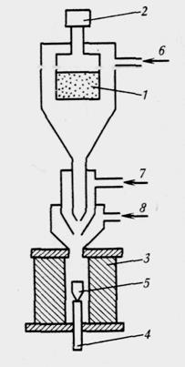 1 – шихта; 2 – дозатор; 3 – кристаллизационная камера; 4 – кристаллодержатель; 5 – кристалл; 6,8 – подача кислорода; 7 – подача водорода.
