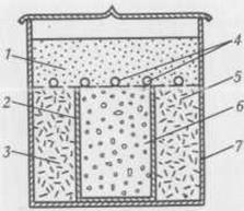 1 – растворитель; 2 – цилиндрический платиновый стакан; 3 – смесь из двух компонентов; 4 – затравочное устройство; 5 – платиновая отбойная пластина; 6 – третий компонент; 7 – платиновый тигель.