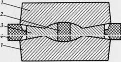 Синтез алмаза проводится в камере типа "чечевица" объемом несколько кубических сантиметров (рис. 7). Нагревание осуществляется индукционным методом или прямым пропусканием электрического тока. При сближении пуансонов реакционная смесь графита с никелем (а также со слоистым пирофиллитом) сжимается, при этом в камере развивается давление выше 5 · 102 МПа. В результате происходит перекристаллизация гексагональной кристаллической решетки графита в кубическую структуру алмаза. Размер кристаллов алмаза зависит от времени синтеза, так как при времени реакции 3 минуты образуются кристаллы массой около 10 мг, а 30 мин – 70 мг. Наиболее прочны кристаллы размером до 0,5 – 0,8 мм, более крупные имеют невысокие физико-механические свойства. Кроме описанного метода разработан еще ряд способов выращивания алмазов.