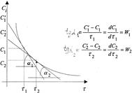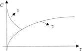 Графическое представление изменения концентрации компонента реакции с течением времени в координатах Сi - иназывают кинетической кривой. Кинетические кривые для исходных веществ и продуктов имеют вид (рисунок 1):