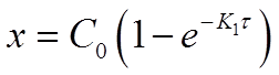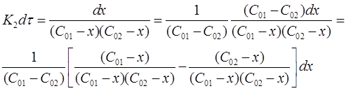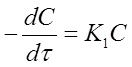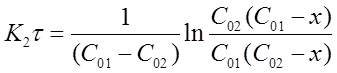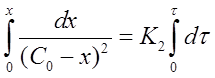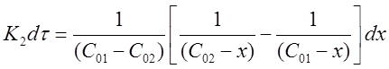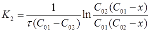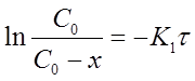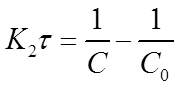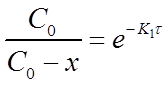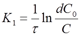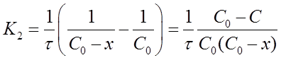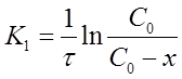 После разделения переменных и интегрирования уравнения в пределах от 0 до х и от 0 до τможно получить выражение для константы скорости реакции