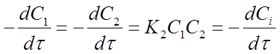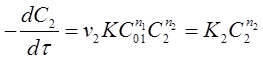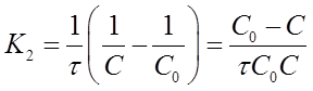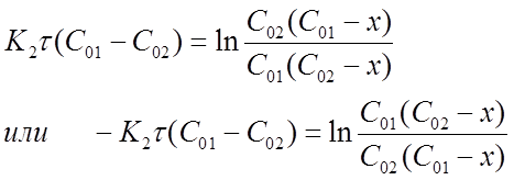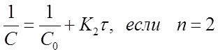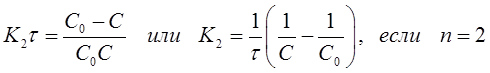 Подстановкой в эти уравнения опытных значений концентраций С исследуемого вещества, в разные моменты времени протекания реакции, вычисляют значения К. Если расчетные К, например, по уравнению (31) остаются постоянными, то это означает, что порядок реакции по веществу равен двум.