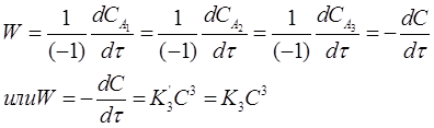 Если концентрации исходных веществ СА1 =СА2 =СА3 =С в любой момент времени, то кинетическое уравнение скорости второй реакции имеет вид: