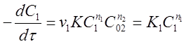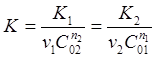 Если удастся определить величины п1 и п2 , то можно будет найти общий порядок реакции по формуле (24) и константы скорости К1 и К2 , а затем константу скорости реакции по формуле: