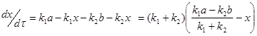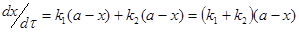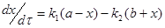 имеет первый порядок в обоих направлениях. Обозначим через a и b – начальные концентрации, а через х – уменьшение концентрации исходного вещества к моменту времени τ или количество прореагировавшего вещества.