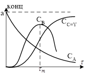 Такой вид кривых как показывает анализ, характерен для случаев, когда и различие констант на один порядок. Количество пром. вещества в р-ии систематически изменяется со временем по кривой с максимума. Условия экстремума. Продиф. по ур. 5 приравнивая к 0 полученные уравнения найдём из него выражения для времени, достаточного чтобы промеж. вещество достигло макс. концентрации. Если подставить в полученное выражение для в Ур 5 то после соответствующего преобразования получится следующее из уравнения 7 следует что накопление вещества В не зависит от величины константы, а зависит только от их соотношения, чем меньше, т.е. чем быстрее идёт 1-ая р-ия по сравнению со 2 тем выше лежит максимум кривой и тем ближе он к начальному моменту времени. Скорость накопления продуктов р-ии – вещества С в начале процесса очень мала, этот период называется периодом индукции, по его истечении скорость накопления продуктов резко увеличивается