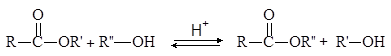 Реакция этерификации катализируется кислотами. Без добавления кислоты равновесие достигается очень медленно, но если же смесь спирта и кислоты нагревать в присутствии небольшого количества концентрированной серной кислоты или хлороводорода, равновесие устанавливается за несколько часов.