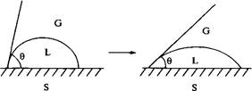 Из уравнения следует, что растекание жидкости по поверхности твердого тела можно усилить двумя способами. Введение поверхностно-активных веществ может приводить к уменьшению как поверхностного натяжения ylg> так и межфазного натяжения между твердым телом и каплей Ysl, что проиллюстрировано на рис. 5.