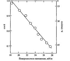 Критическое поверхностное натяжение жидкости ус определяется как точка, в которой прямая, выражающая зависимость cos от поверхностного натяжения жидкостей, пересекает линию нулевого краевого угла, т. е. линию, соответствующую полному смачиванию. На рис. 4 ус = 5 мН/м. Теоретически все жидкости, поверхностное натяжение которых гLG равно или ниже ус , должны растекаться по этой поверхности. Однако на практике ус не является постоянной величиной для данного твердого тела, а несколько меняется в зависимости от природы жидкости.