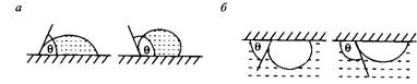 Капля жидкости, помещенная на твердую поверхность, может растекаться по ней таким образом, что площади поверхностей жидкость-твердое тело и жидкость-газ увеличатся. При этом площадь поверхности твердое тело-газ сократится, а краевой угол и между каплей и поверхностью твердого тела уменьшится.