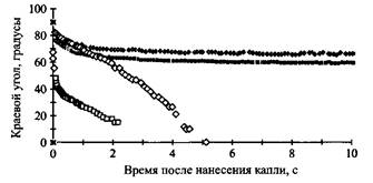 Рис. 13. Зависимость краевого угла от времени для четырех различных материалов с примерно одинаковой свободной поверхностной энергией, но различающихся по транспортным свойствам
