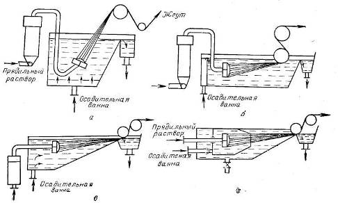 Рис.2. Различные схемы мокрого формования полиакрилонитрильного штапельного волокна: а - вертикальное; б - горизонтальное; в- горизонтальное с гидравлическим вытягиванием; г - формование с гидравлической насадкой.