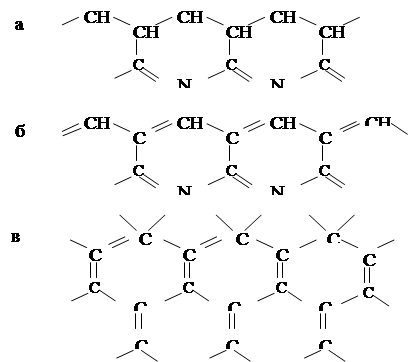 Теплостойкость ПАН-волокон и нитей сравнительно низкая, так как при температурах 1000 С и 1500 С они теряют 20-23% и 50% исходной прочности соответственно. Однако, для ПАН нитей характерна способность к полимераналогичным превращениям при длительном выдерживании их при температурах более 200о С в присутствии кислорода. В результате окислительных процессов происходит циклизация ПАН (рис.3, а,б), волокно чернеет и становится нерастворимым, снижается прочность, но повышается устойчивость к действию температур. Дальнейший прогрев окисленного ПАН-волокна до 10000 С (карбонизация) и 20000 С (графитация) приводит к образованию углеродного волокна (рис.3, в), которое способно эксплуатироваться при температурах 2000-30000 С, обладая достаточной прочностью и модулем упругости [5].